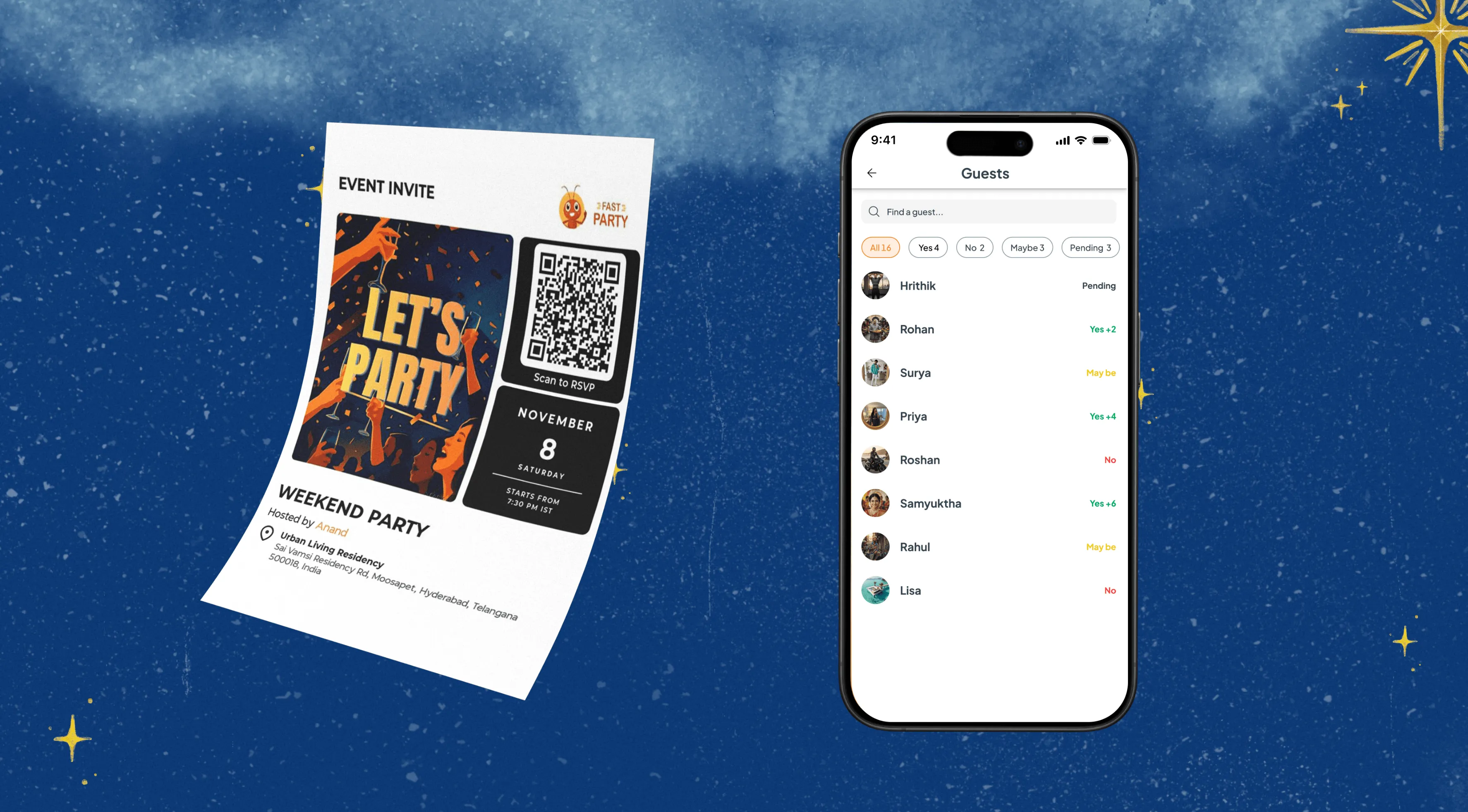Whether it’s a birthday, game night, potluck, or spontaneous celebration, Fast Party is your all-in-one event planning app to make every celebration easy and exciting.