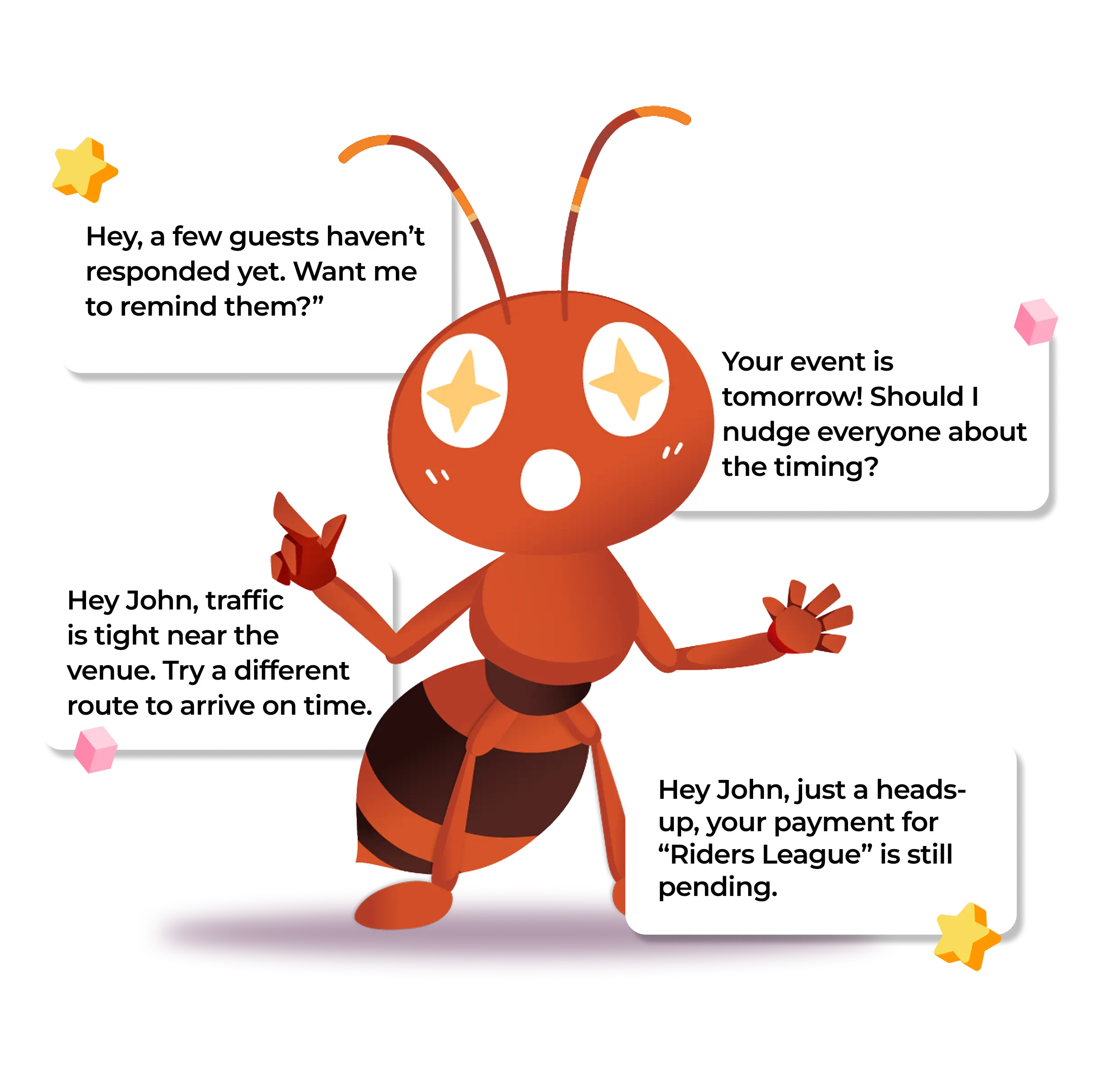 I am your event planning buddy who handles the reminders, updates, and nudges. I manage all the stuff nobody wants to deal with, helping focus on the fun parts.